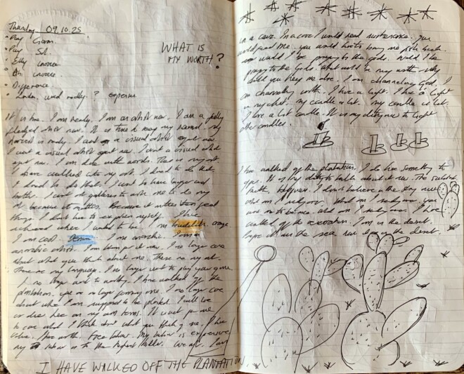 Linda Brogan is a playwright, performer, and visual artist. Recent works include Excavating the Reno (2017), the literal excavation of a 1970s Moss Side funk and soul cellar club, where it was a badge of honour to be mixed-race. In In the Ruins of the Big House (2024) at Factory International, she used her white mum’s status to declare herself the mistress of her dad’s Jamaican plantation. And MY MUM IS WHITE: Exorcising Half-Caste Ghosts (2025) at HOME, Brogan, psychologist and professor Adam Danquah, and five other mixed-race creative and cultural practitioners held a four-week exorcism as Brogan mind-mapped the forest of their ghosts.